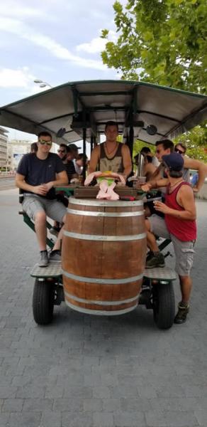 Veselá jazda na obrovskom bicykli. Pre smädných cyklistov je na palube sud dobre vychladeného piva.